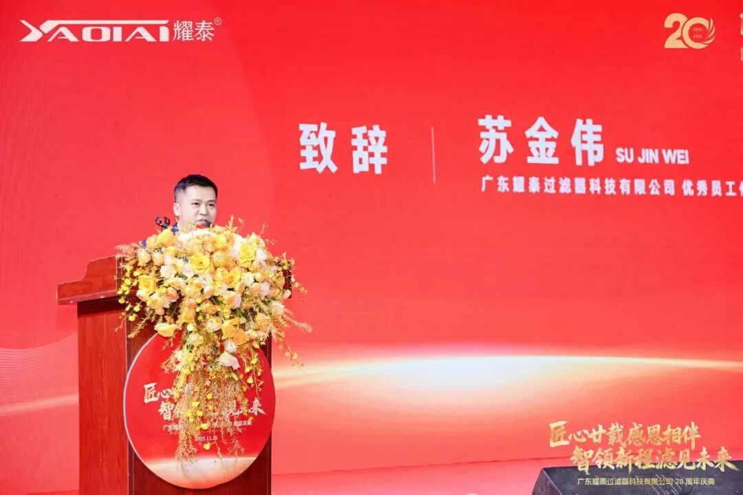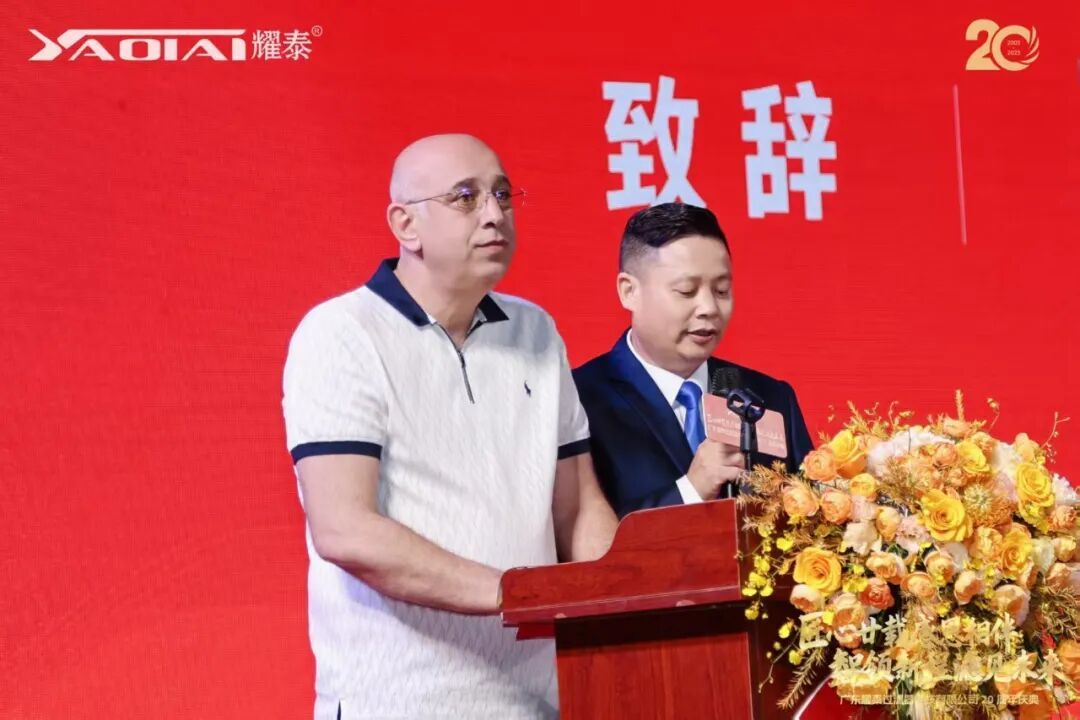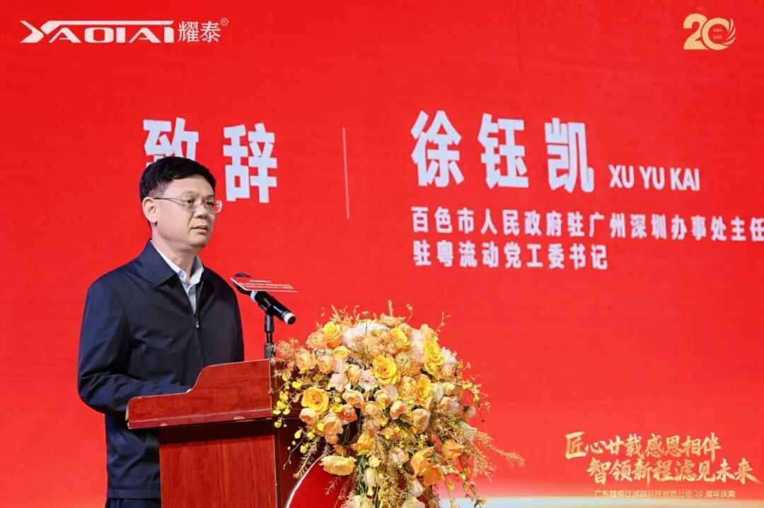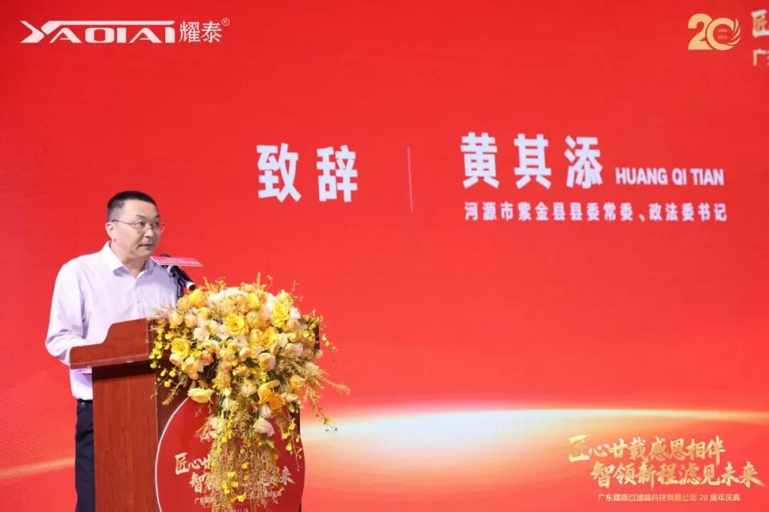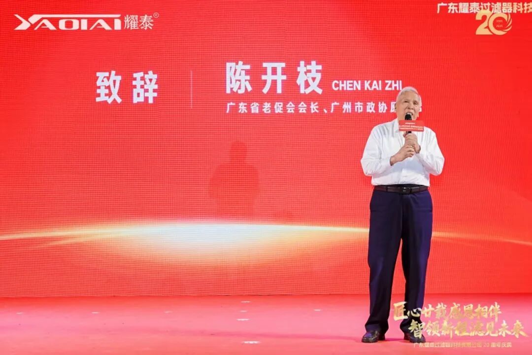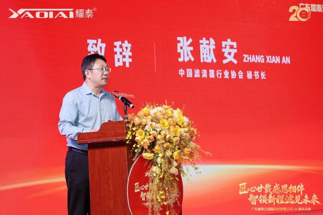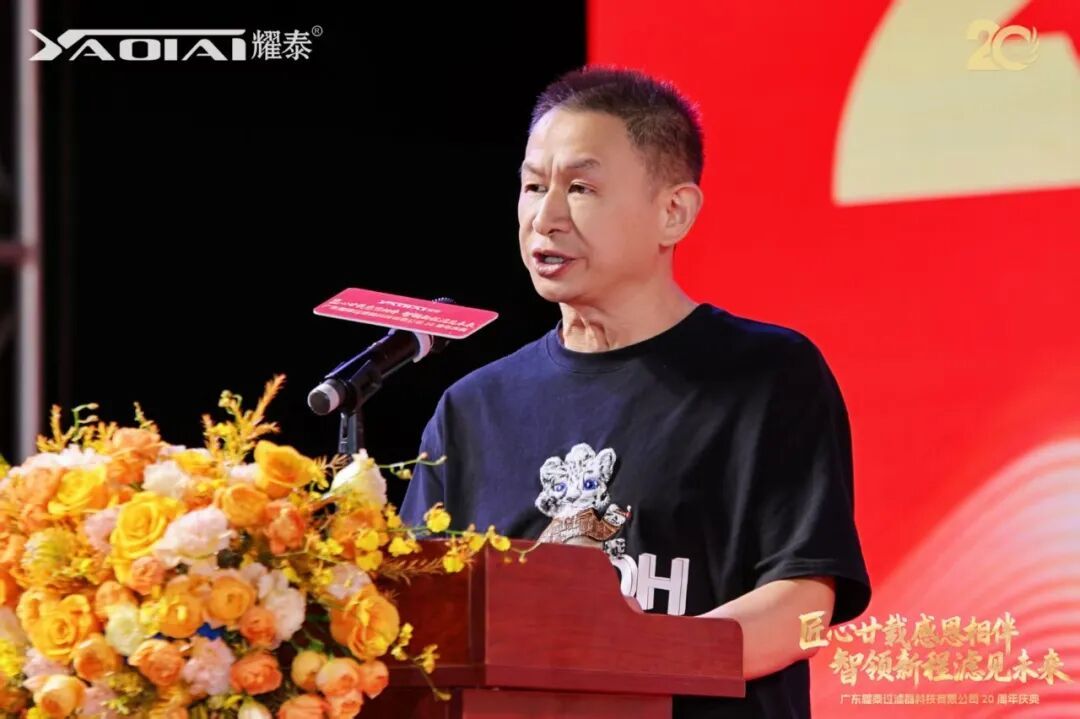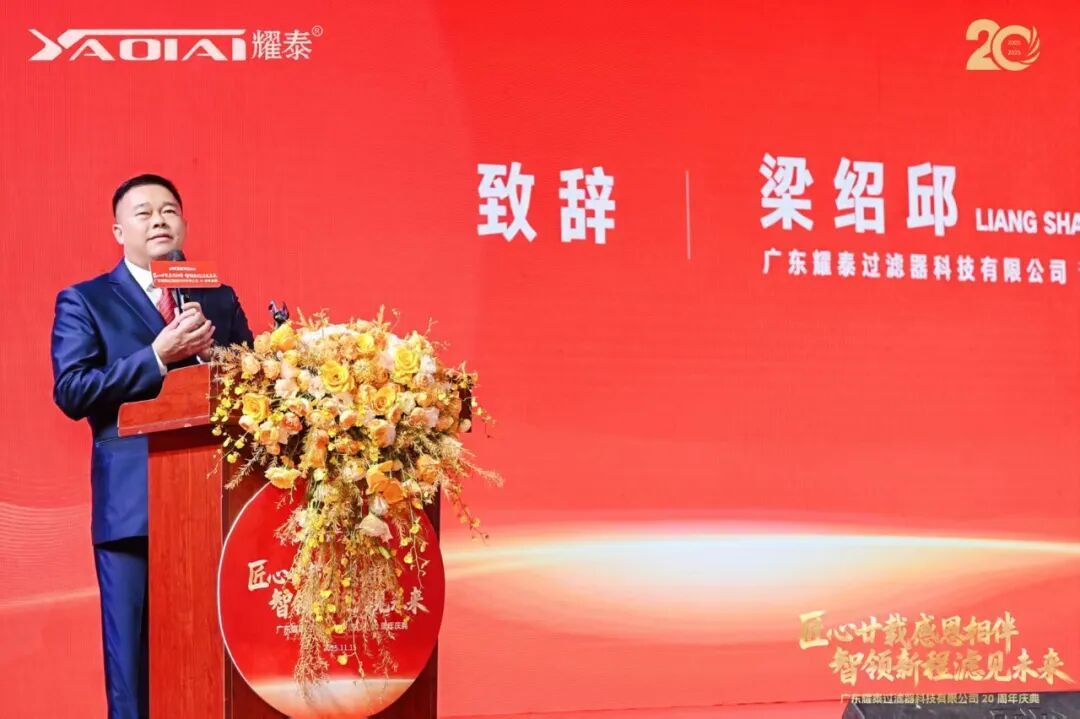 广东耀泰过滤器科技有限公司董事长、我商会常务副会长梁绍邱先生发表了情深意切的致辞。他首先向莅临现场的各位嘉宾、商会同仁及合作伙伴表达了诚挚的感谢,并回顾了耀泰二十年来的发展历程。他表示:“二十年风雨兼程,耀泰的成长离不开每一位伙伴的信任与支持,离不开团队的坚守与创新。我们始终秉持‘匠心’精神,深耕过滤技术,以专业与品质赢得市场。站在新起点,我们将继续以智慧引领新征程,以创新‘滤’见更广阔的未来。感恩同行,期待与大家携手共谱新篇!”