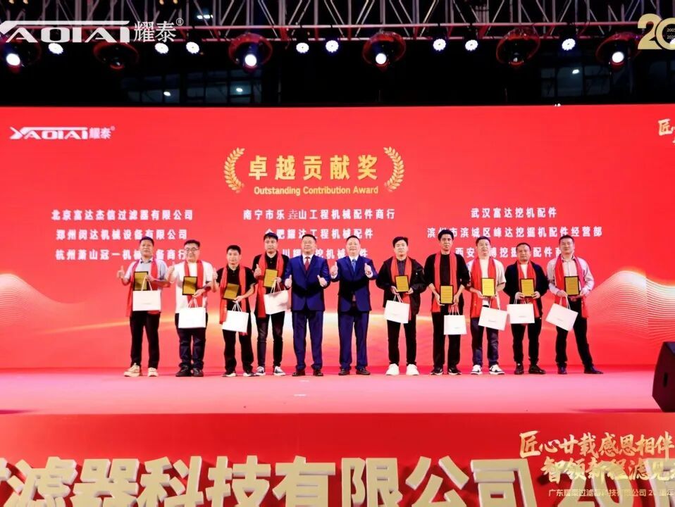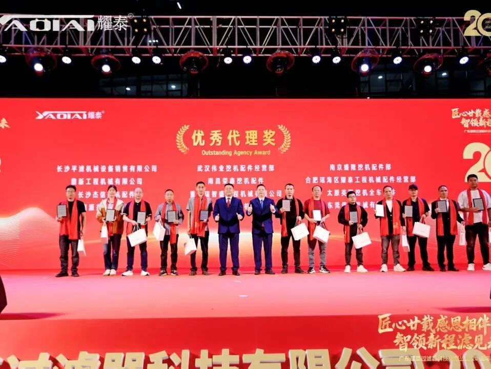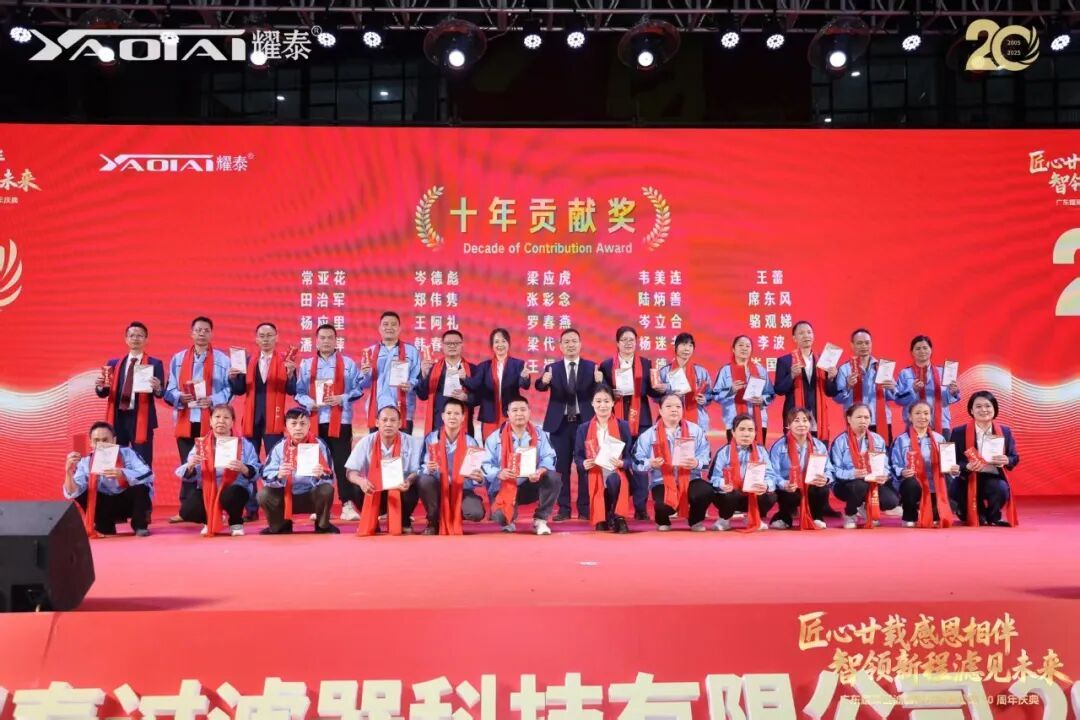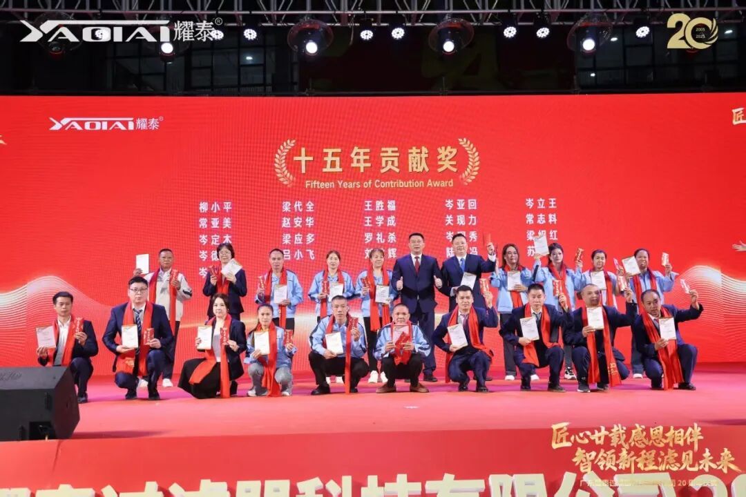 最后,全场最崇高的敬意给予了司龄达二十周年的功勋元老。他们从创业之初便一路相随,将青春与智慧毫无保留地奉献于此,见证了耀泰从蹒跚学步到昂首阔步的每一个脚印。梁绍邱常务副会长亲自为他们颁授奖牌,现场氛围在感恩与感动中达到高潮。这一刻,闪耀的不仅是奖杯,更是忠诚、奉献与匠心精神的璀璨光芒。